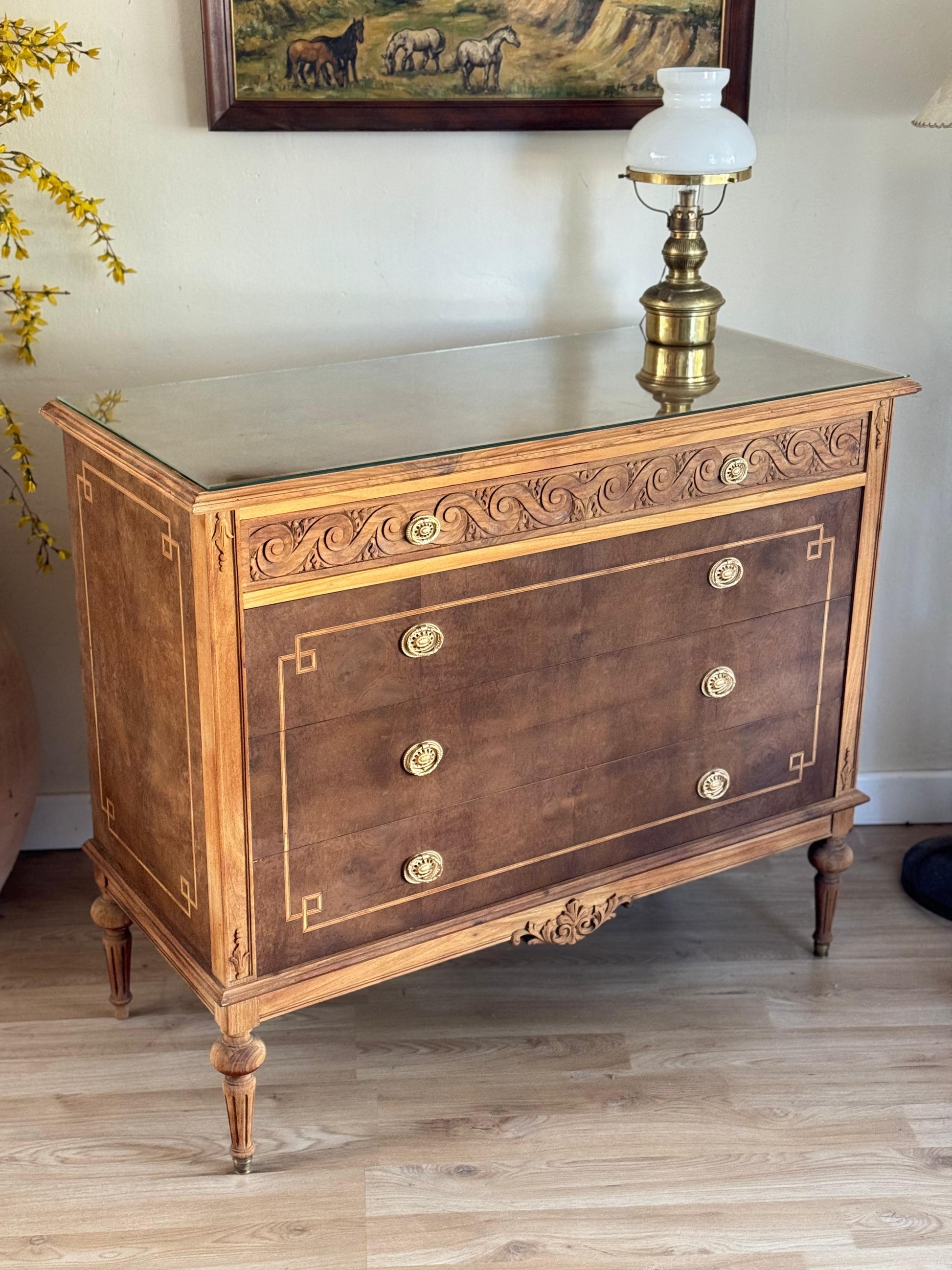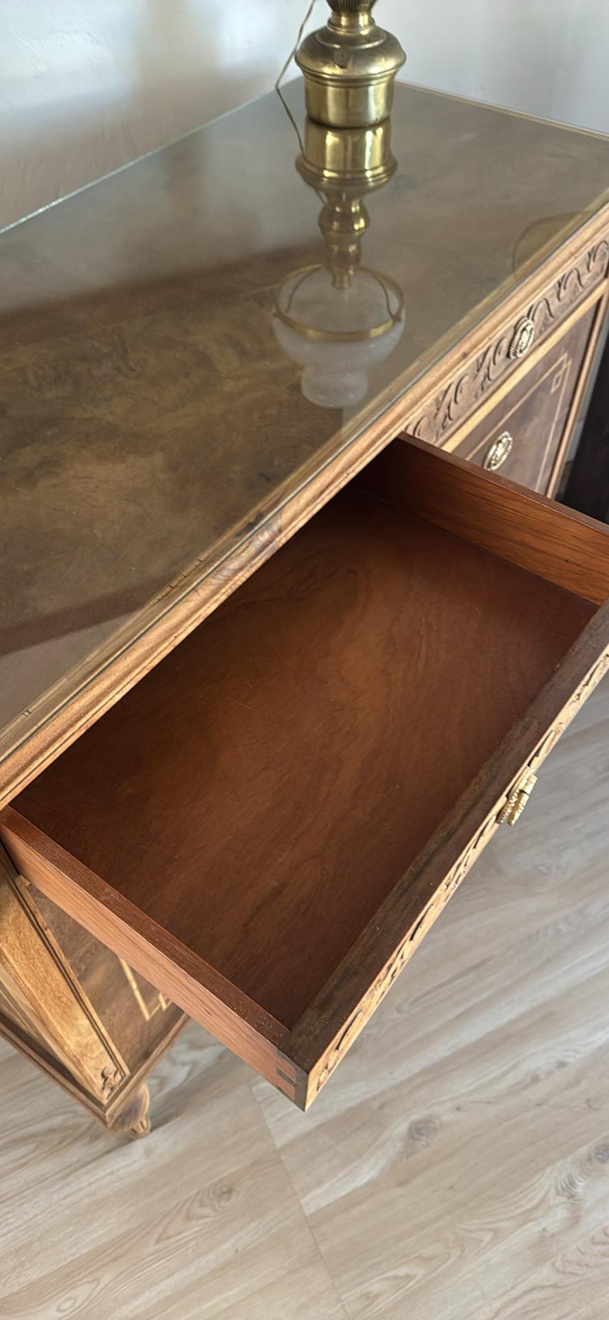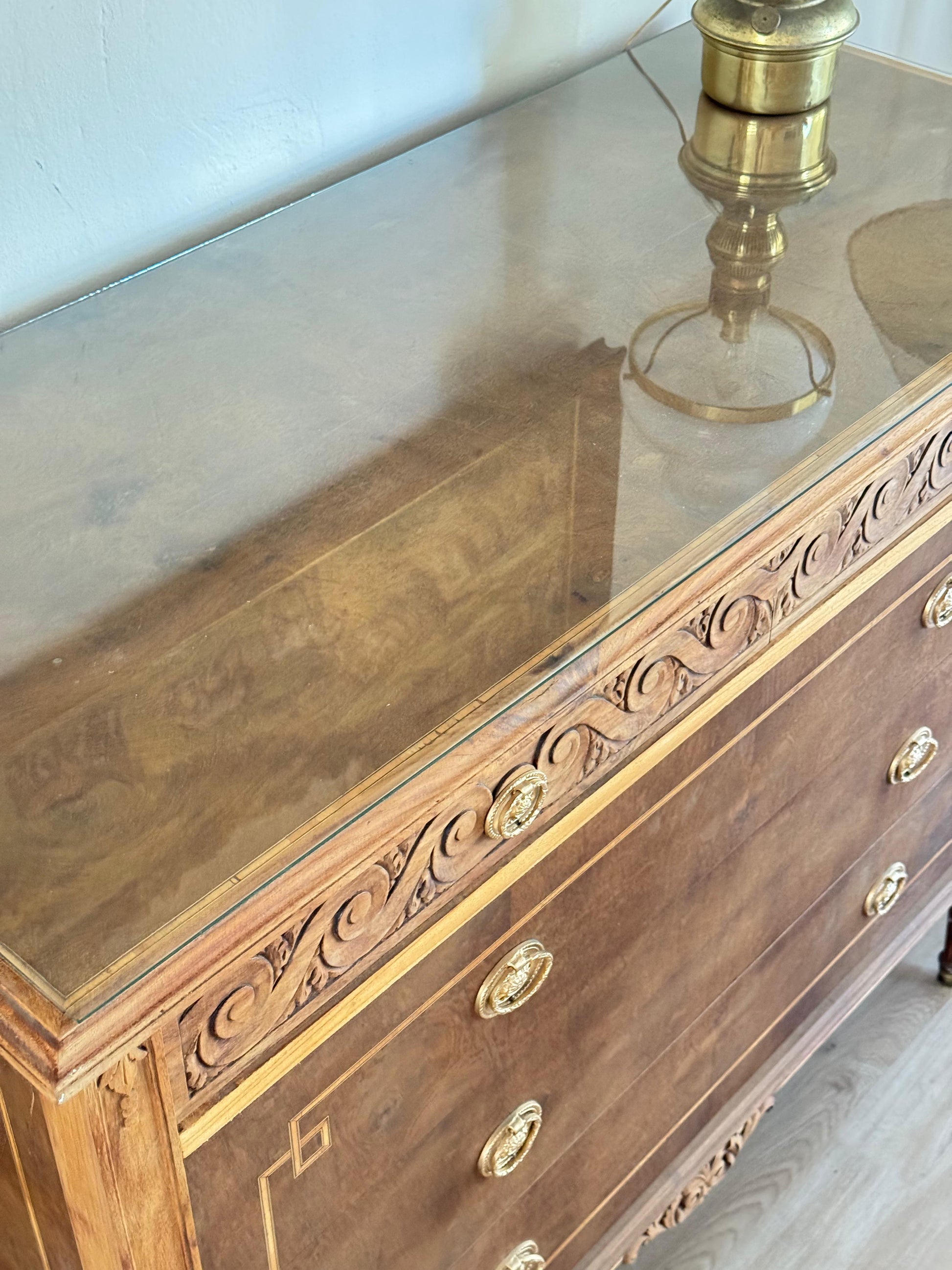 Espectacular cómoda Luis XVI en caoba y cedro. Con vidrio biselado y marquetería. Súper amplia!