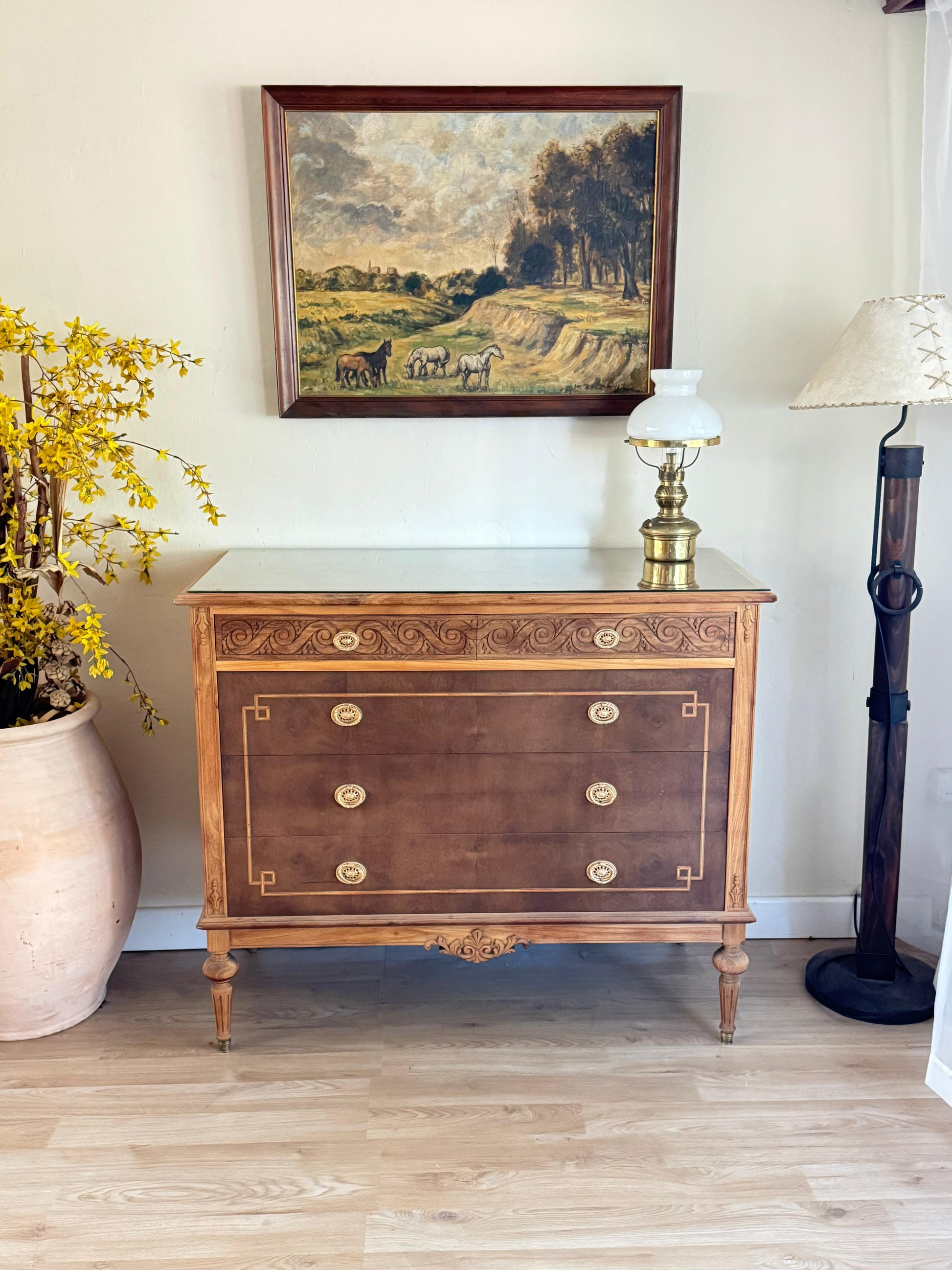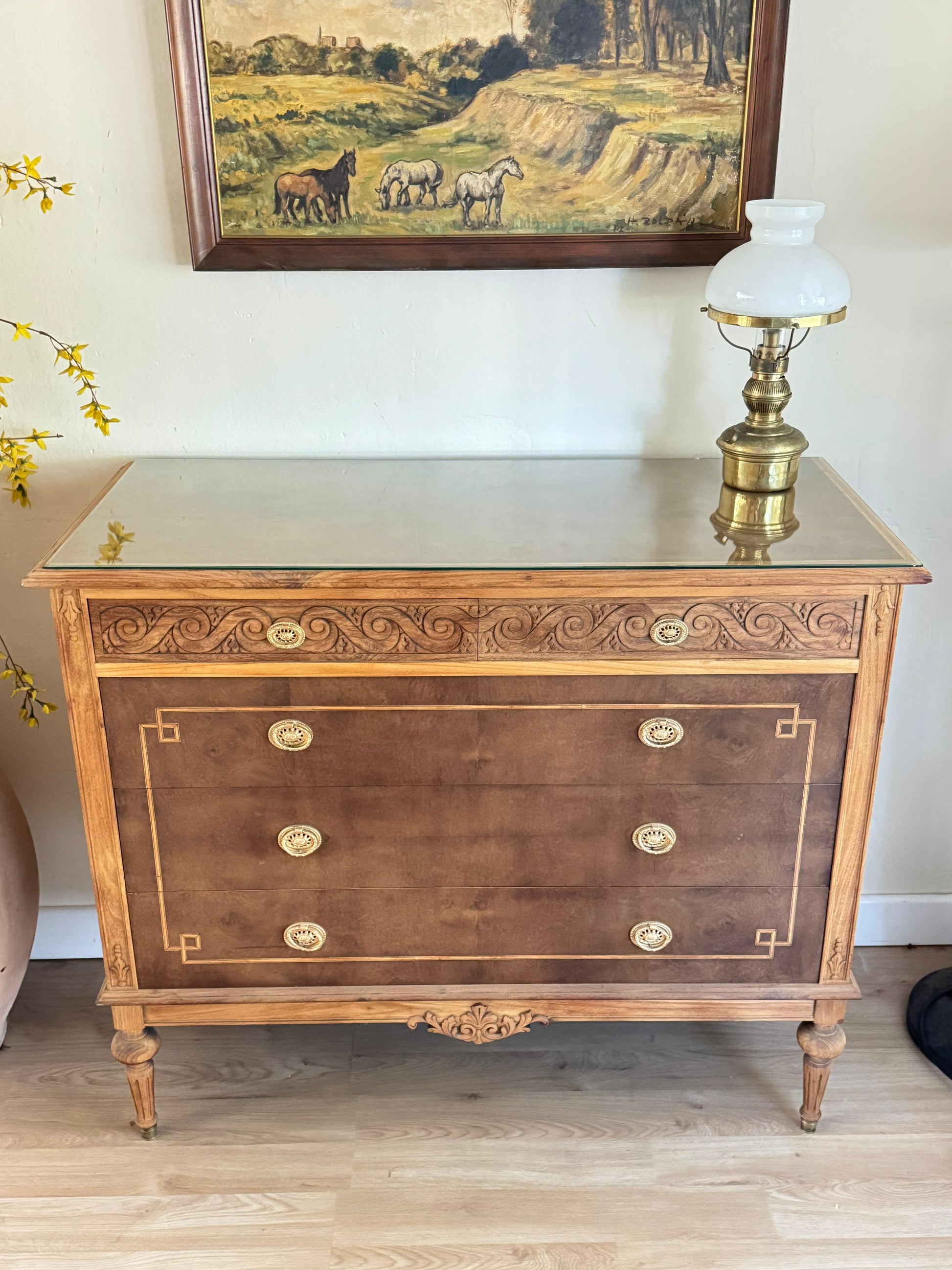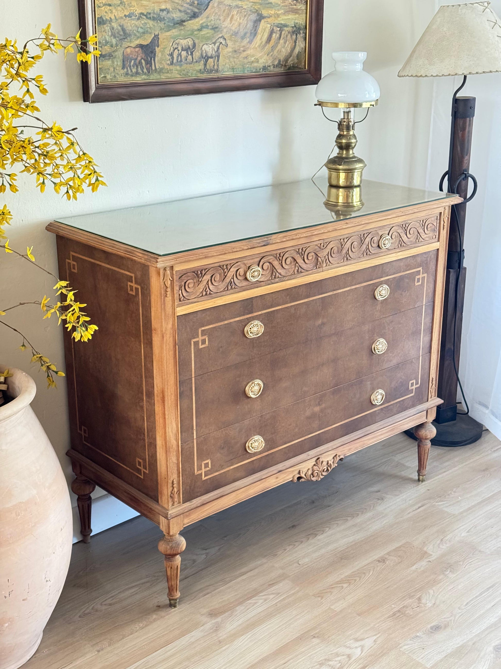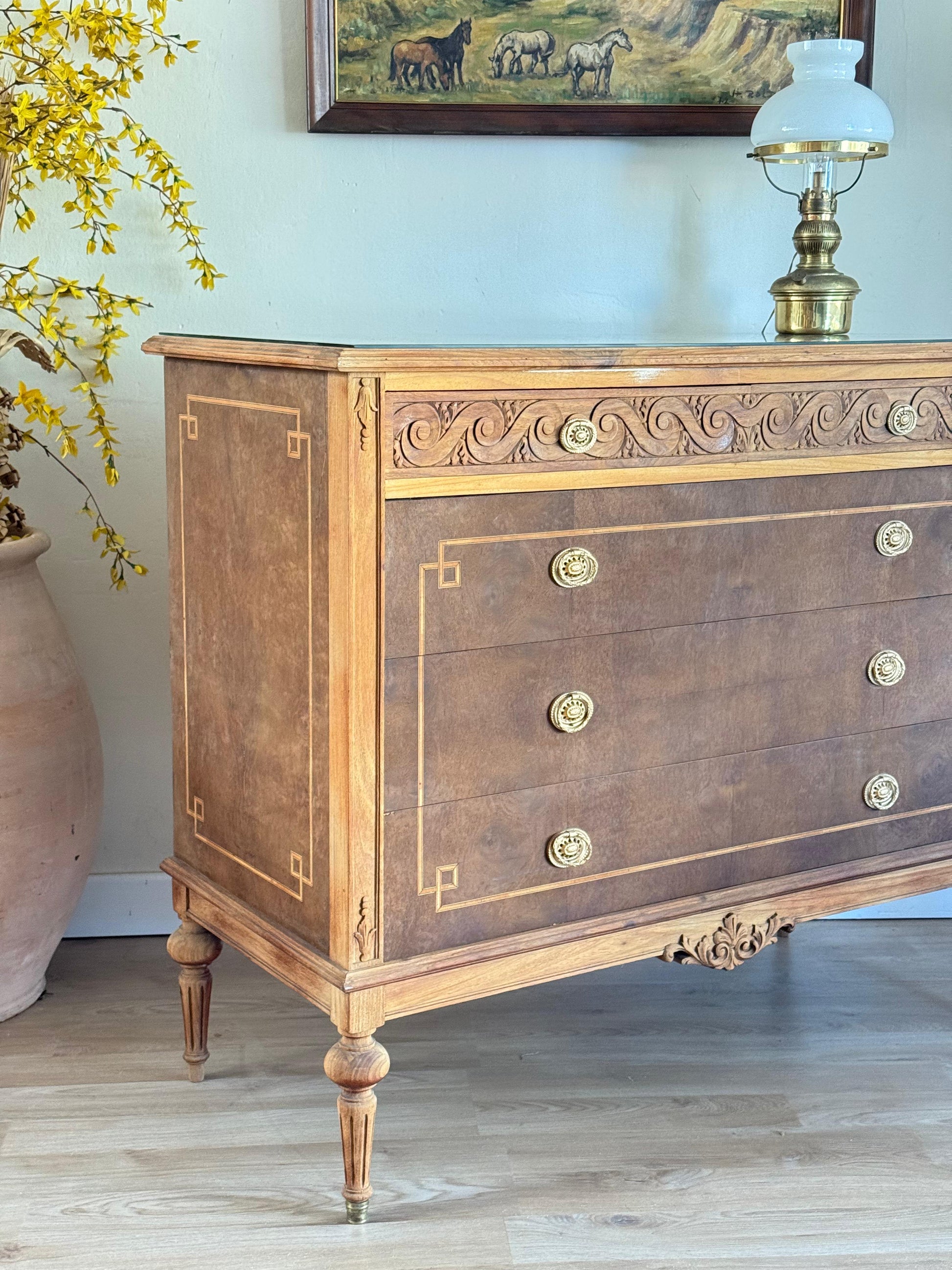 Espectacular cómoda Luis XVI en caoba y cedro. Con vidrio biselado y marquetería. Súper amplia!