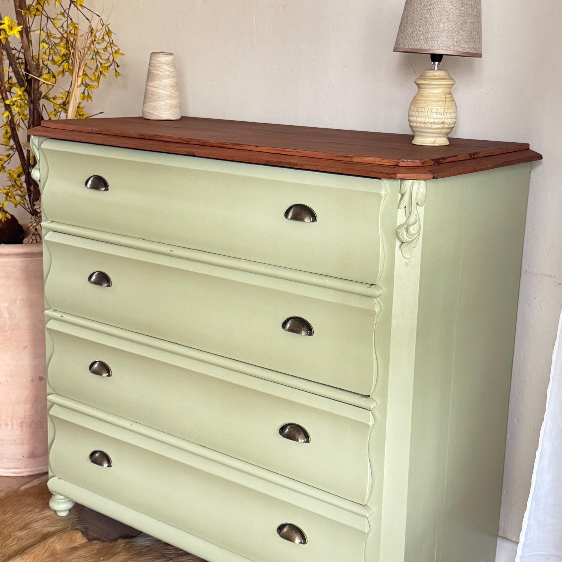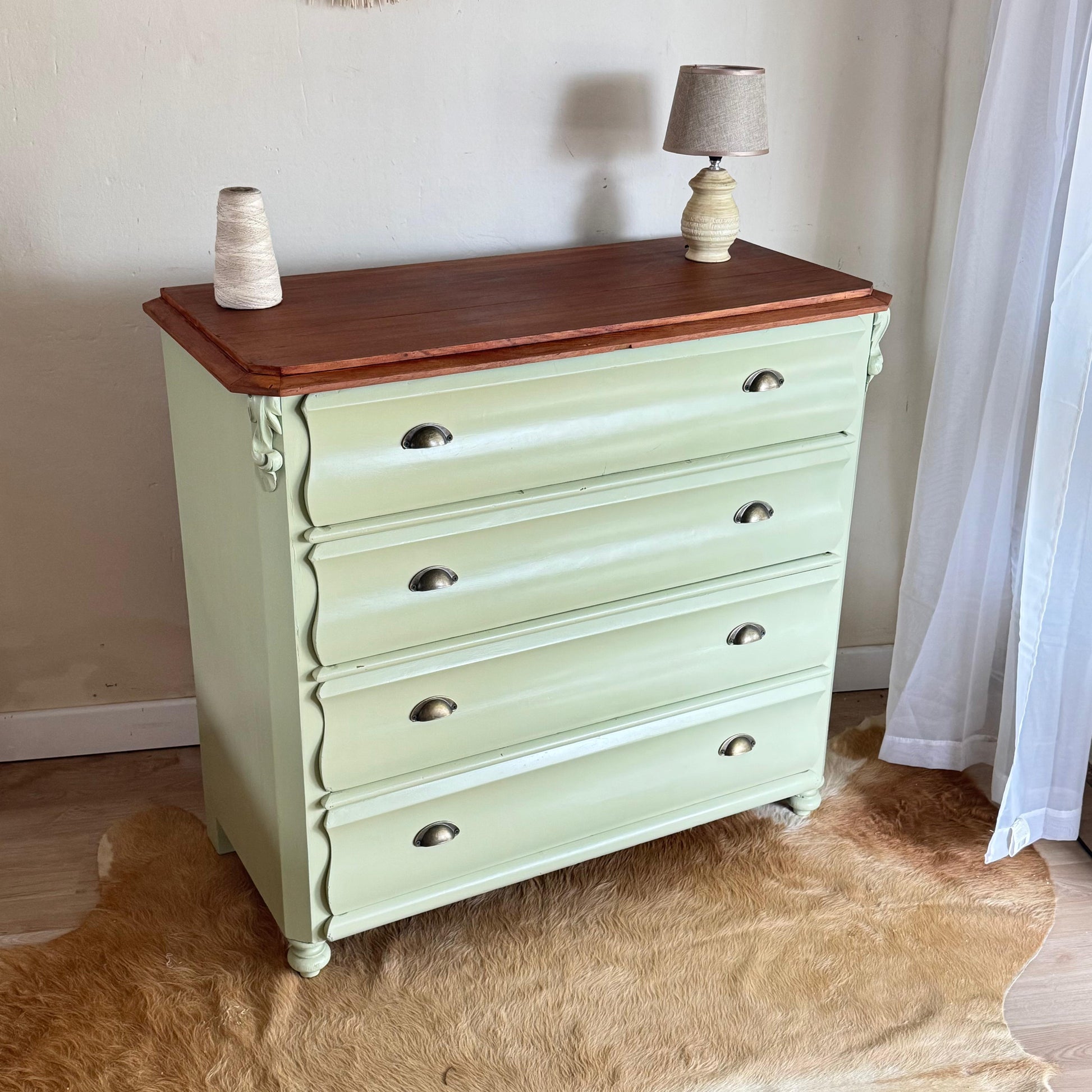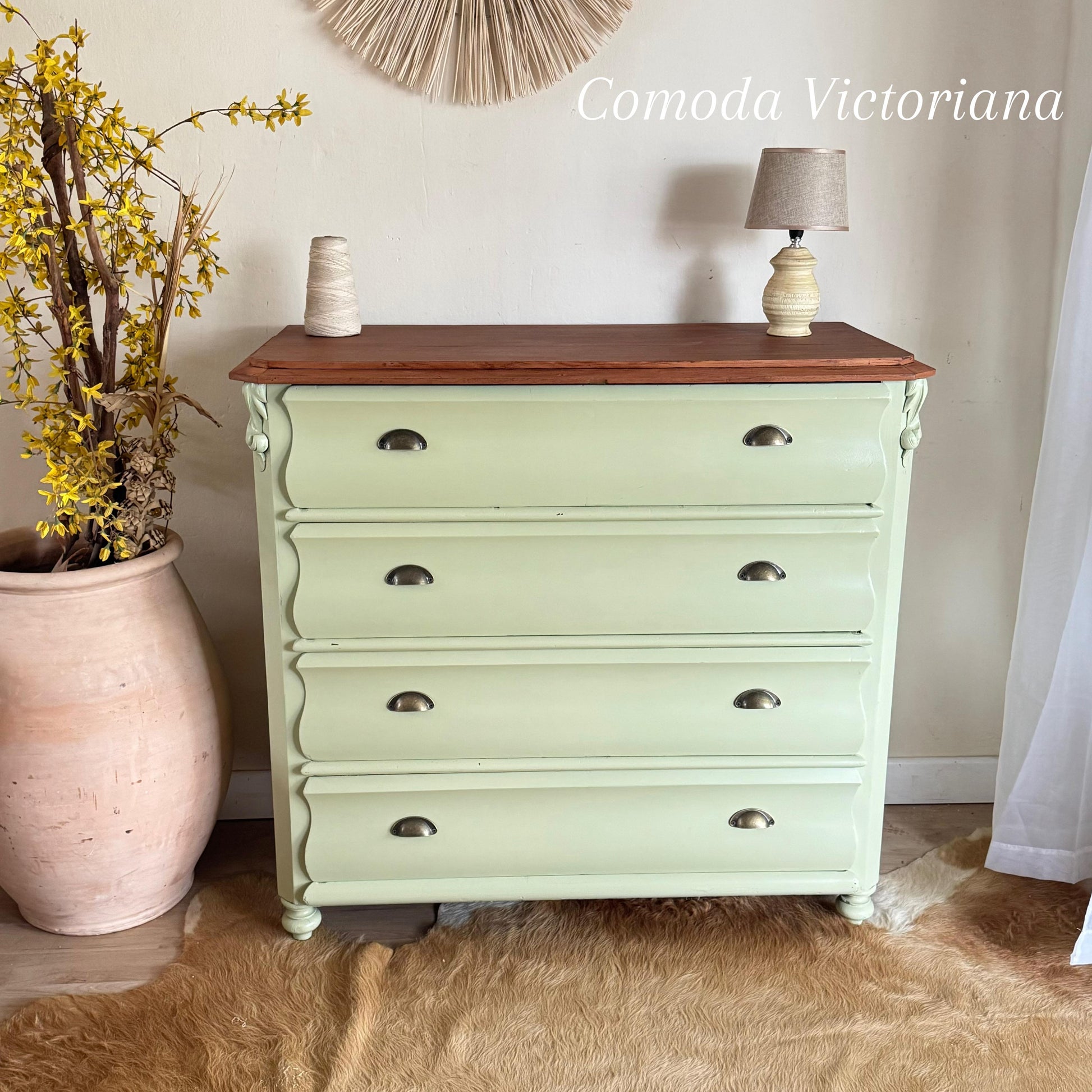 Hermosa cómoda victoriana en madera de cedro, cuatro cajones amplios. De muy buena capacidad, pintada de Green Lily. Excelente estado, muy buenas dimensiones.