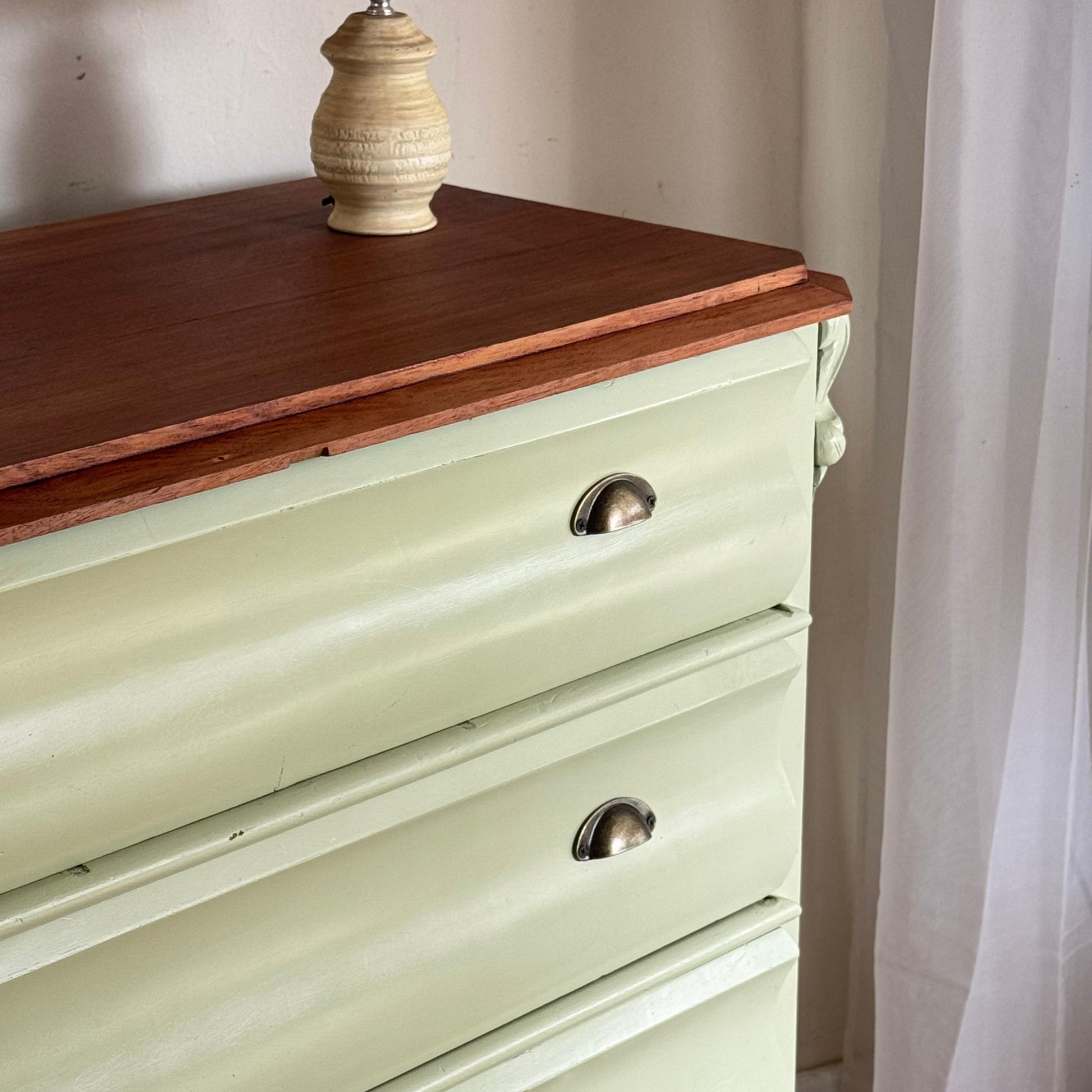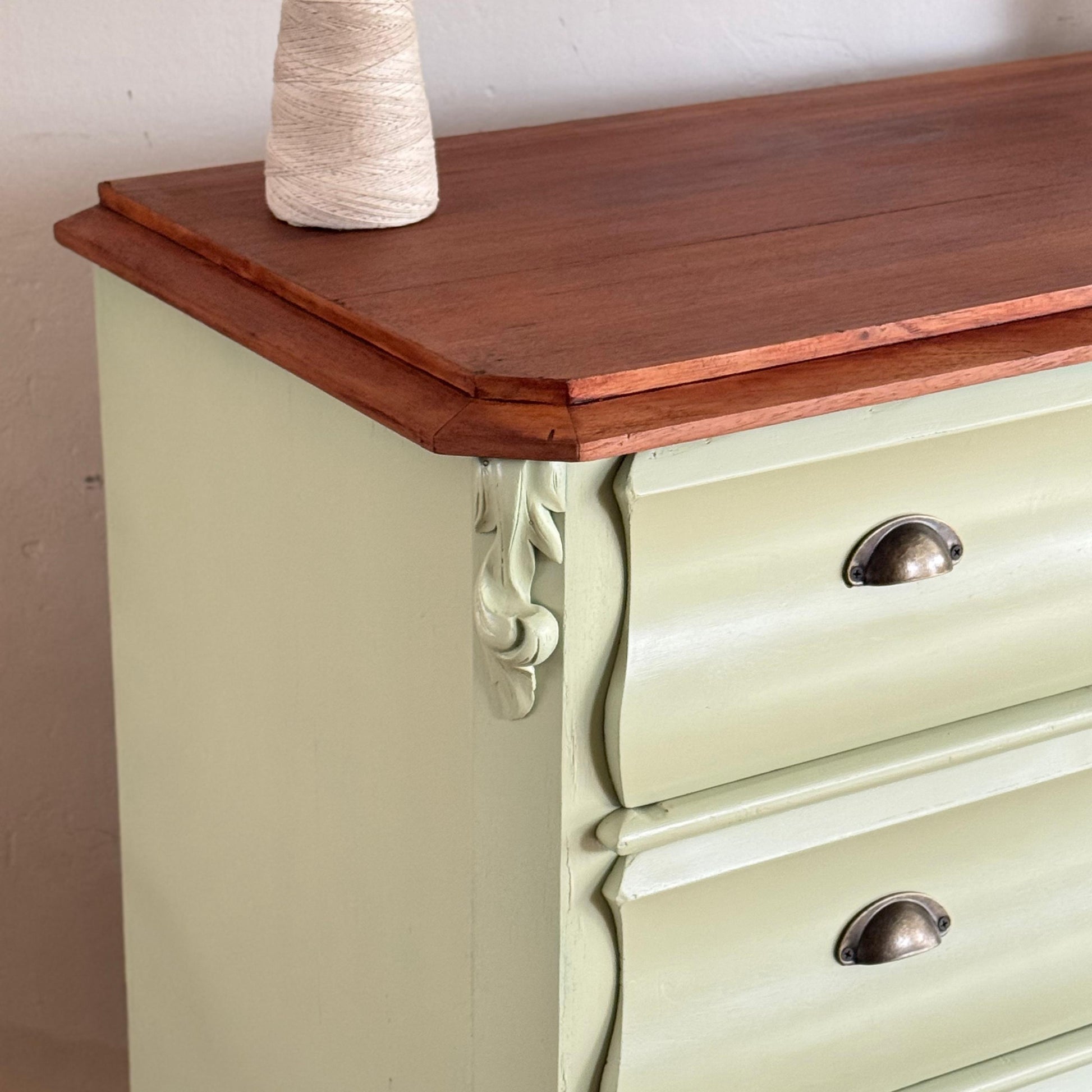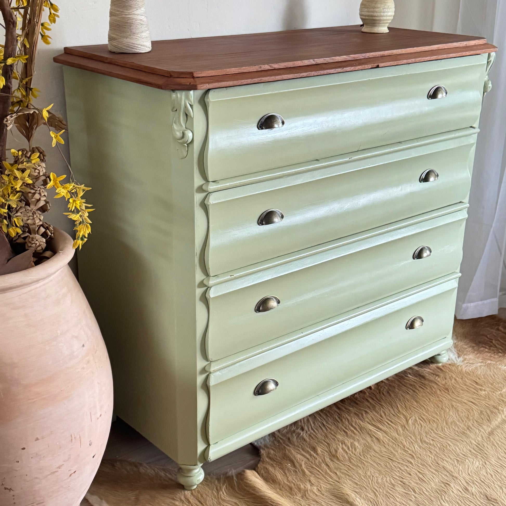 Hermosa cómoda victoriana en madera de cedro, cuatro cajones amplios. De muy buena capacidad, pintada de Green Lily. Excelente estado, muy buenas dimensiones.